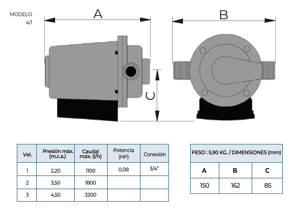 - Pérdida de carga máxima en succión: 4 m.c.a.